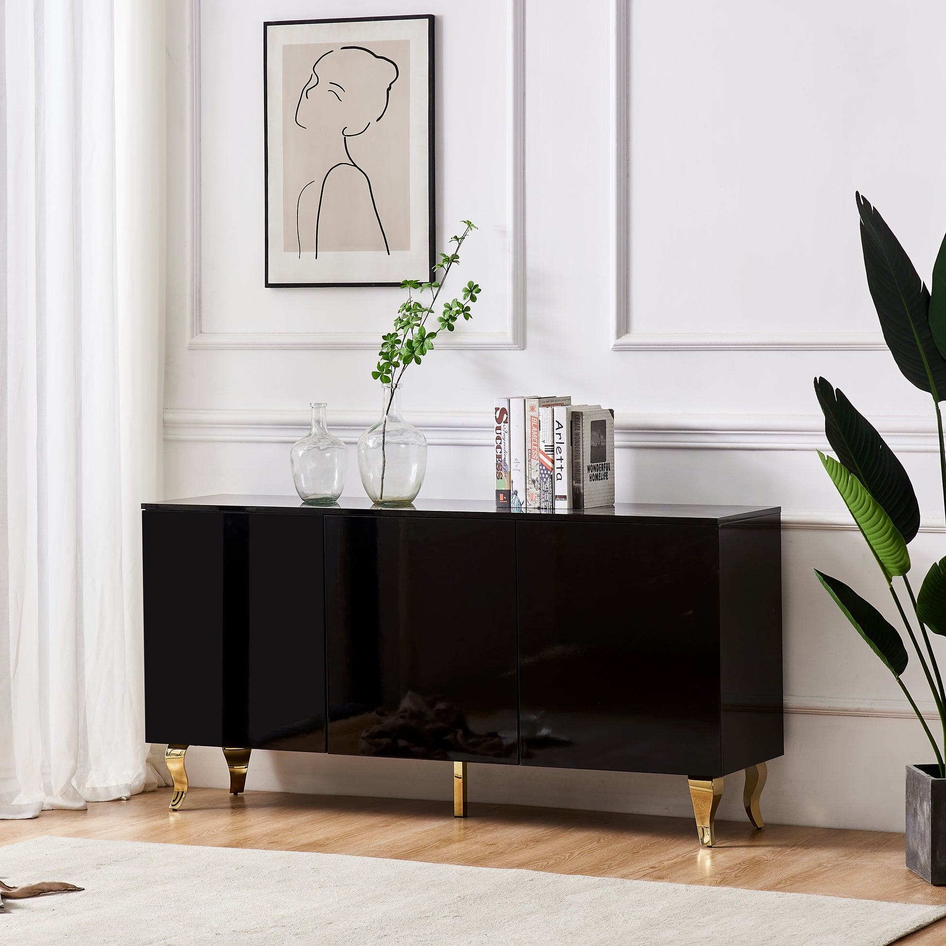 Collection : BAROQUEType : Buffet 3 portesFinition : Laque noire brillante – élégante et facile d’entretienStructure : Bois MDF, finition premiumRangement : 3 portes, espaces de rangement intérieursStyle : Baroque moderne, Élégant, IntemporelUtilisation : Salle à manger, salon, entréeMontage : OuiEntretien : Chiffon doux, pas de produit abrasifParticularité : Aspect brillant profond, idéal pour un intérieur sophistiqué
