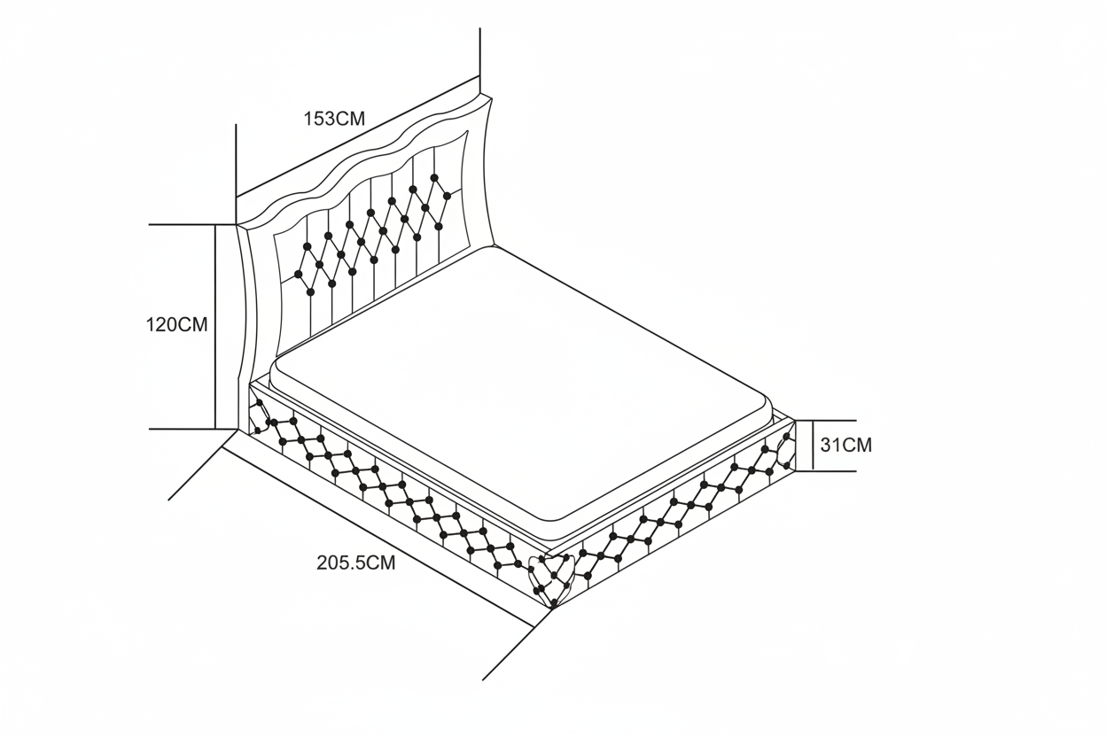 DimensionsCouchage : 140 x 190 cmLargeur totale : 153 cmLongueur totale : 205,6 cmHauteur du cadre : 31 cmHauteur tête de lit : 120 cm