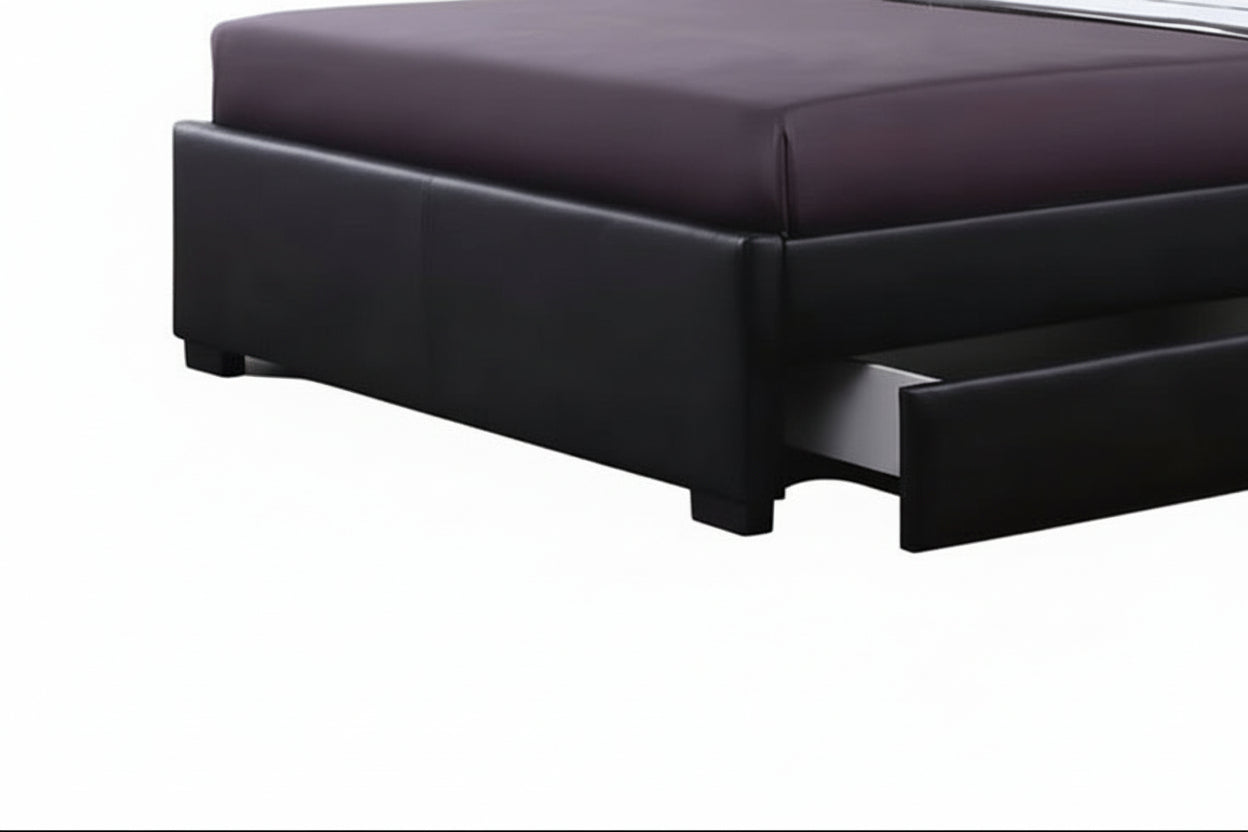 CaractéristiquesStructure avec sommier inclusRevêtement simili cuirColoris : noirTête de lit LED intégréeÉclairage LED multicoloreTélécommande incluse4 tiroirs de rangement intégrésBarre centrale et 2 pieds de renfortLit vendu sans matelas