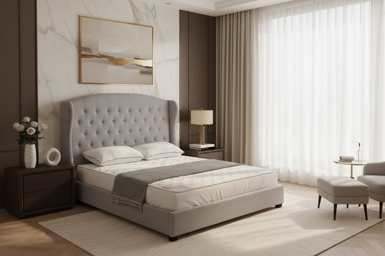 Choisissez le lit Bergerac en tissu gris 140×190 cm pour une chambre élégante et confortable. Livraison rapide.