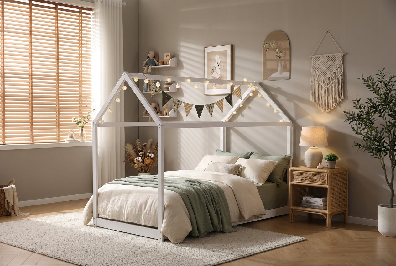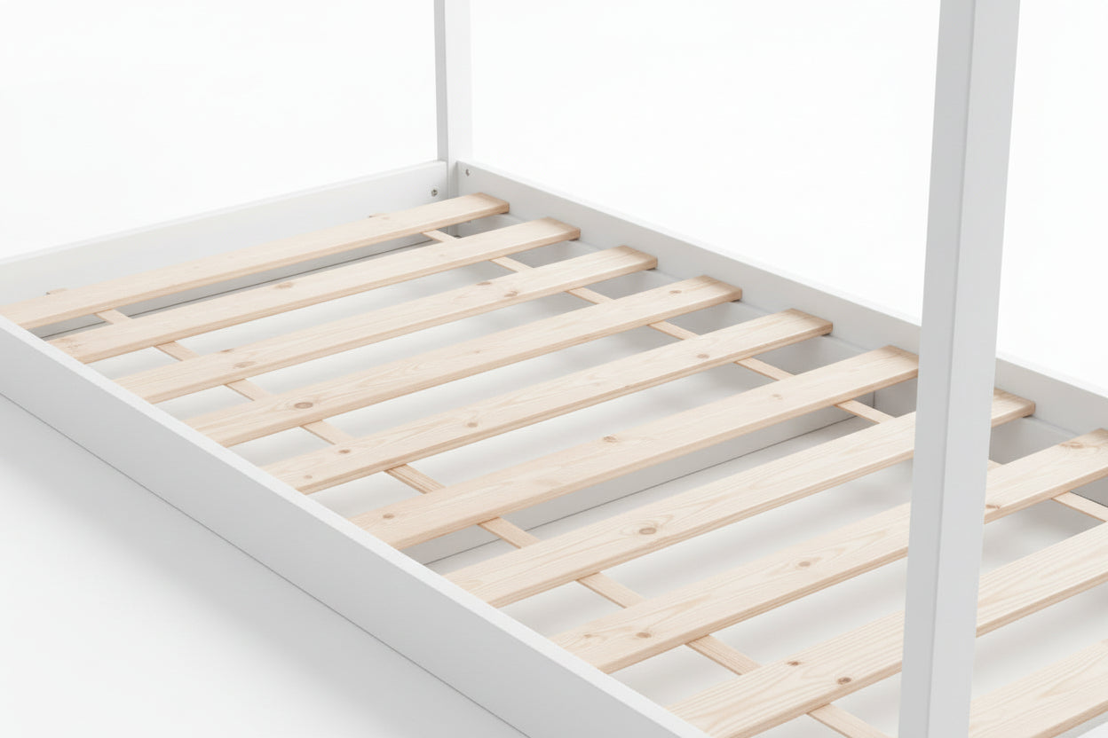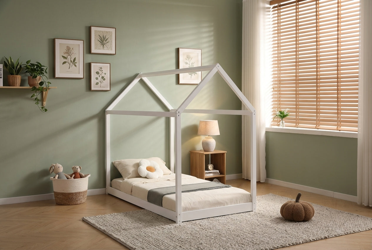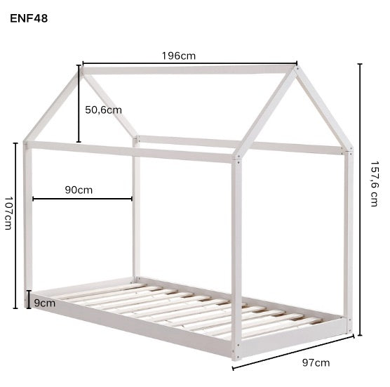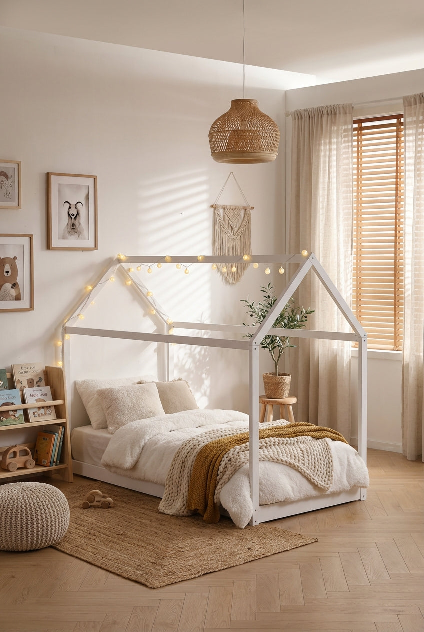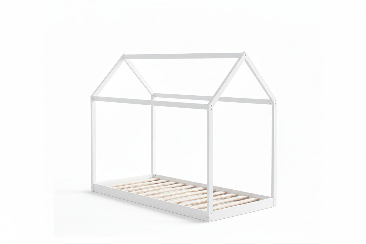 Ce lit cabane pour enfant transforme l’espace nuit en un environnement ludique et rassurant grâce à sa structure en forme de maisonnette ouverte. Conçu en bois peint blanc, il s’intègre facilement dans une chambre d’enfant tout en favorisant l’autonomie et l’imaginaire. Sa conception basse permet un accès simple et sécurisé au couchage, tandis que le sommier à lattes intégré assure un soutien adapté au quotidien. Robuste et fonctionnel, ce lit convient aussi bien pour le repos que pour les moments de jeu, tout en optimisant l’aménagement de la chambre.