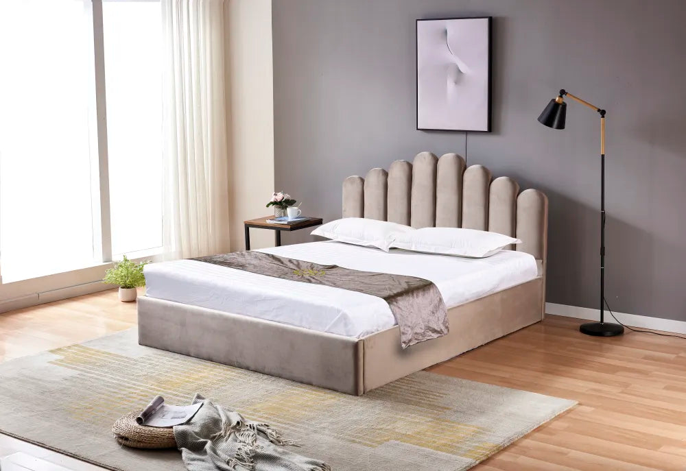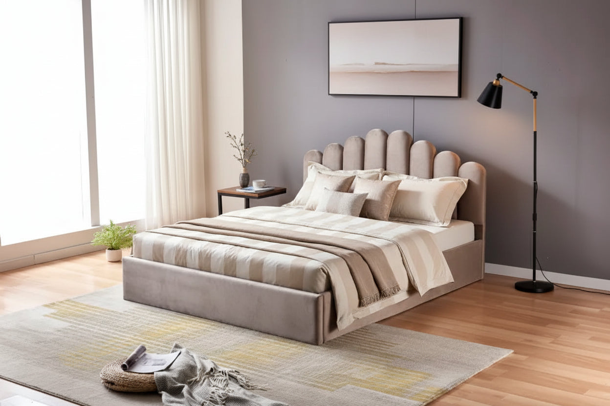 La tête de lit en forme de coquillage, apporte une touche d’originalité et de charme à votre pièce.
