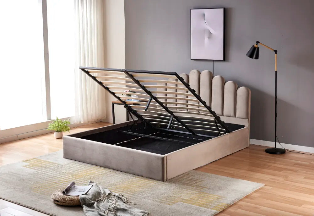 Optez pour le lit coffre Doha 2 places en velours moka 160×200 cm. Design élégant, rangement astucieux. Livraison gratuite.