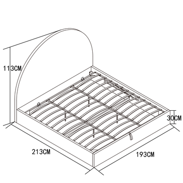 Couchage : 180 x 200 cmLargeur totale : 193 cmLongueur totale : 213 cmHauteur tête de lit : 113 cmHauteur du pied de lit : 30 cm