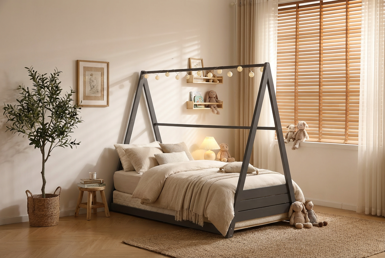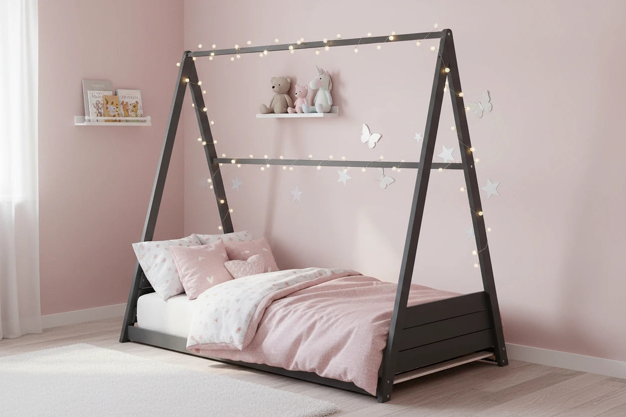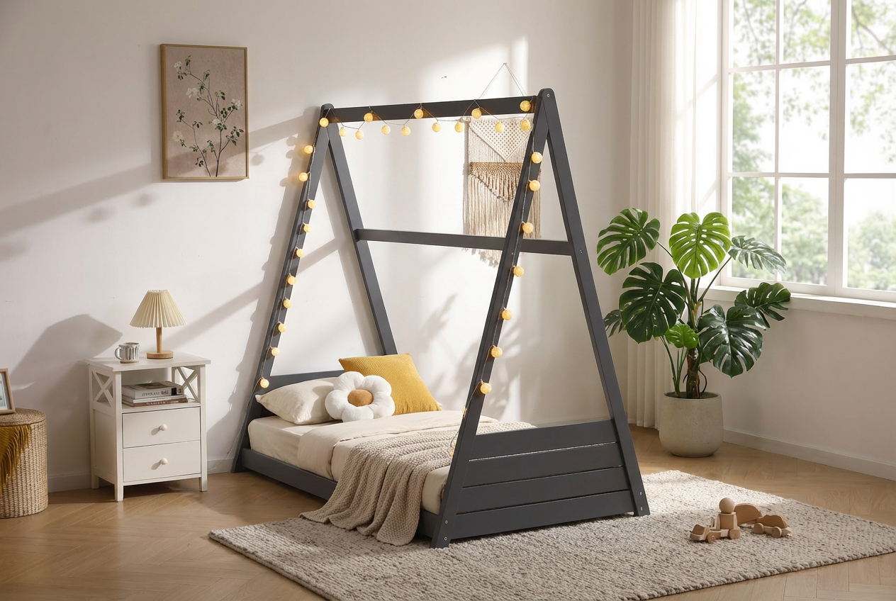 Le lit tipi pour enfant offre un espace de sommeil simple et fonctionnel. Sa structure en bois massif peint en gris assure solidité et stabilité. Les lignes épurées et la forme en A créent un design contemporain et ouvert. Le lit peut être personnalisé avec des guirlandes, tissus ou mobiles, apportant une touche créative à la chambre. Son cadre repose directement sur le sol, offrant un accès facile aux enfants tout en garantissant une bonne ventilation sous le matelas.