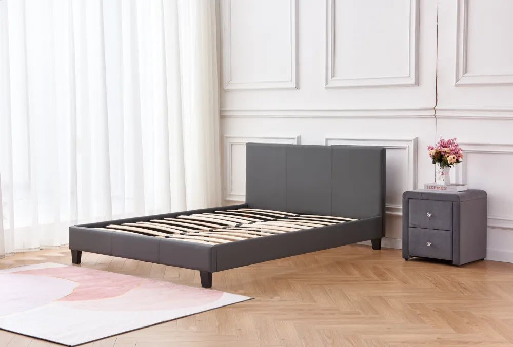 Lit Melbourne 2 places en simili cuir gris 140×190 cm avec sommier intégré. Design contemporain, robuste et facile d’entretien. Livraison gratuite.