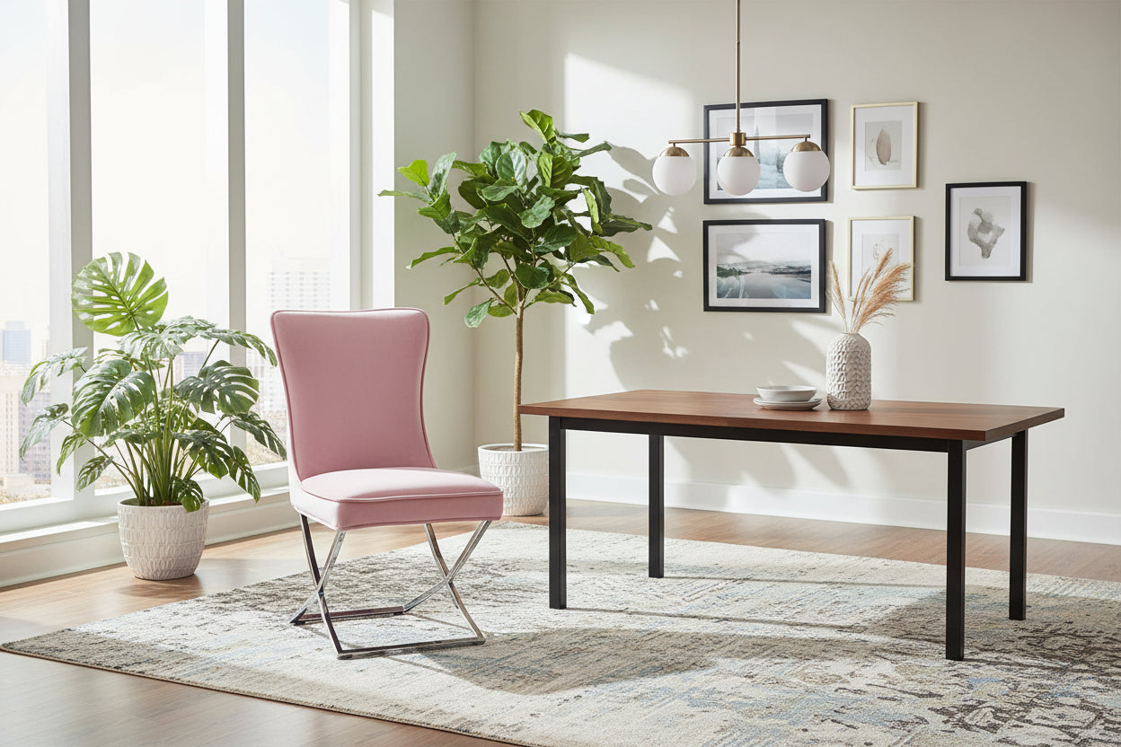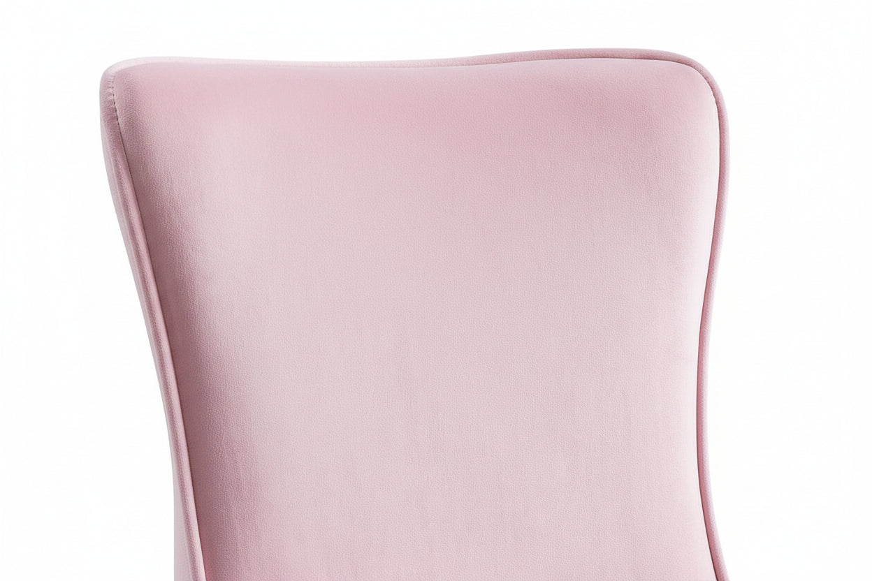 Apportez une touche glamour à votre salle à manger avec le lot de 2 chaises GABRIELLE capitonnées en velours rose et pieds chrome. Leur sellerie luxueuse, profonde et matelassée, associée au dossier capitonné, crée une assise confortable et un rendu baroque moderne ultra chic. Les pieds en acier inoxydable finition chrome assurent une robustesse durable et une stabilité idéale au quotidien, tout en apportant une brillance élégante qui met en valeur votre décoration. La teinte rose apporte une note délicate et raffinée, parfaite pour créer une ambiance chic et harmonieuse, dans un intérieur classique comme contemporain.