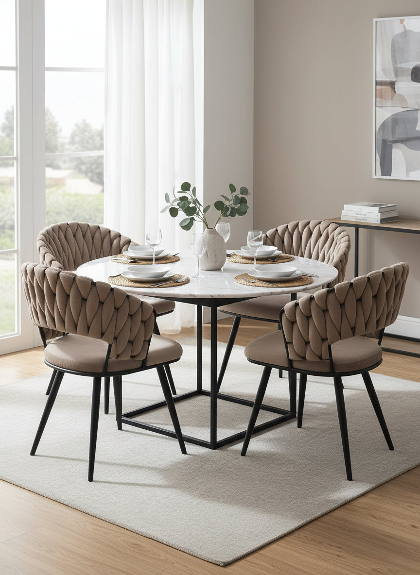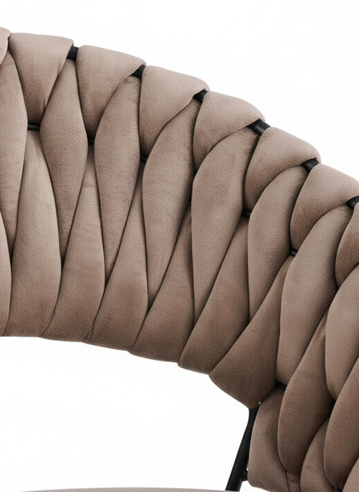Dossier tressé en velours taupe apportant élégance et originalité. Conception enveloppante pour un maintien confortable durant les repas. Structure métallique noire stable et durable. Velours taupe chaleureux offrant douceur tactile et style moderne. Ce lot de chaises Carolina combine esthétisme contemporain et confort optimal pour embellir tout espace repas.