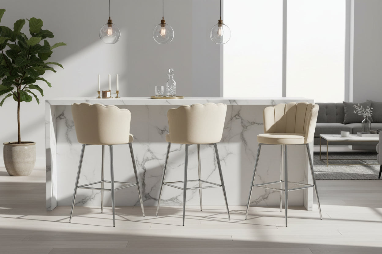 Sublimez votre espace avec le lot de 2 tabourets de bar NYMPHEA en velours beige et piètement finition chrome, un duo au design unique pensé pour apporter confort et élégance à votre intérieur. Leur assise en velours, agréable au toucher, offre un confort idéal pour profiter pleinement de vos moments au comptoir, à la maison comme dans un espace professionnel. Le coloris beige apporte une présence douce et lumineuse, facile à associer à de nombreux styles de décoration. Le piètement en métal finition chrome renforce l’aspect moderne et brillant, tout en garantissant stabilité, solidité et durabilité. Avec une hauteur d’assise de 69 cm, les tabourets NYMPHEA s’adaptent parfaitement à la majorité des bars et comptoirs, pour un coin repas chic et accueillant. Pratiques au quotidien, ils sont aussi faciles à entretenir grâce à leur velours simple à nettoyer.