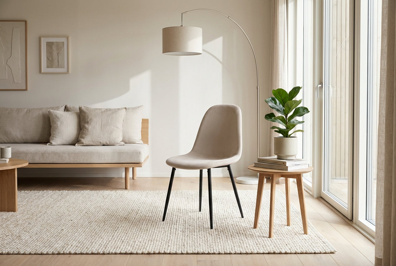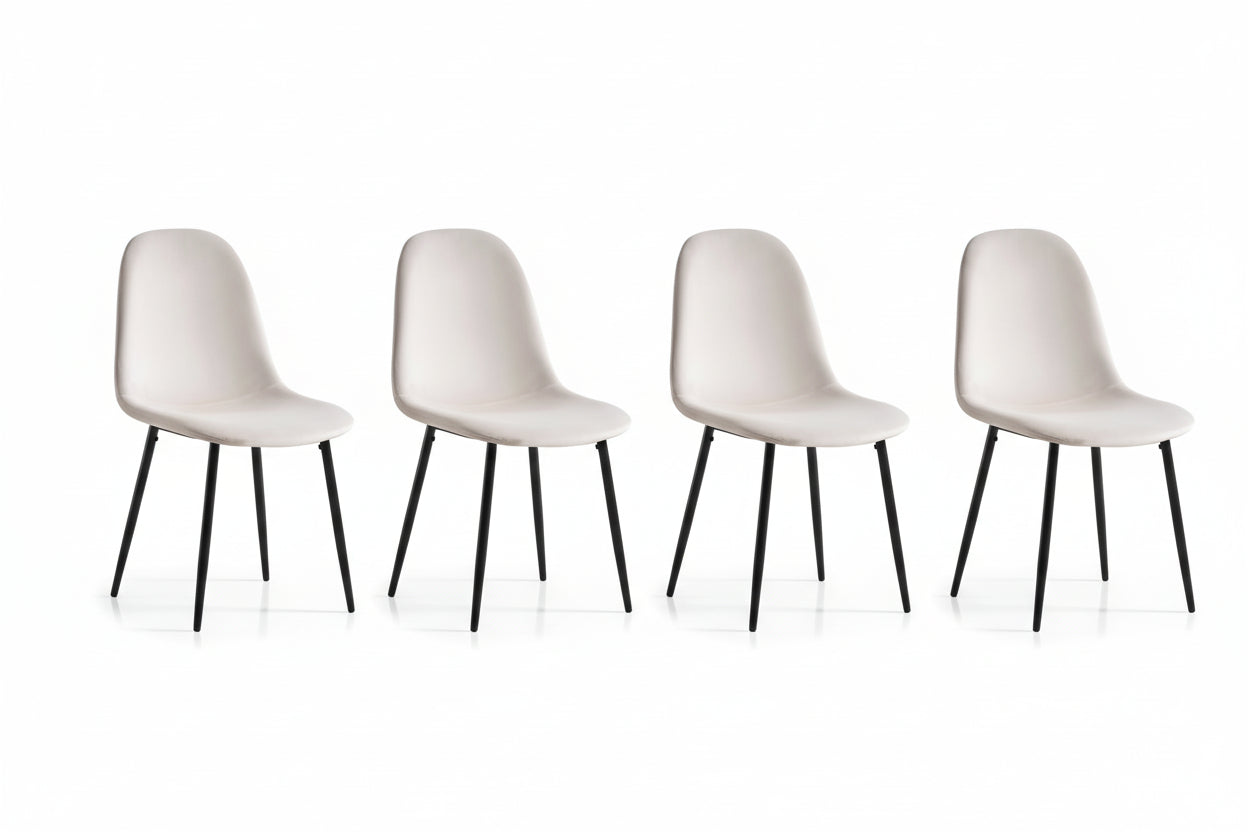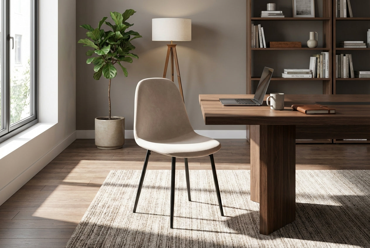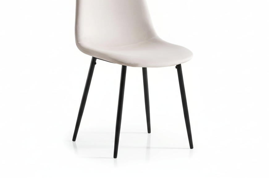Ce lot de 4 chaises scandinaves trouve facilement sa place autour d’une table à manger ou dans un espace de travail. L’assise rembourrée et le dossier fixe offrent un maintien confortable pour les repas, les réunions ou le télétravail. Le velours beige procure un toucher agréable tout en restant simple à entretenir au quotidien. La structure en métal et les pieds noirs garantissent stabilité et durabilité pour un usage régulier. Leur format compact permet de les disposer aisément même dans des espaces réduits, alliant confort et praticité.