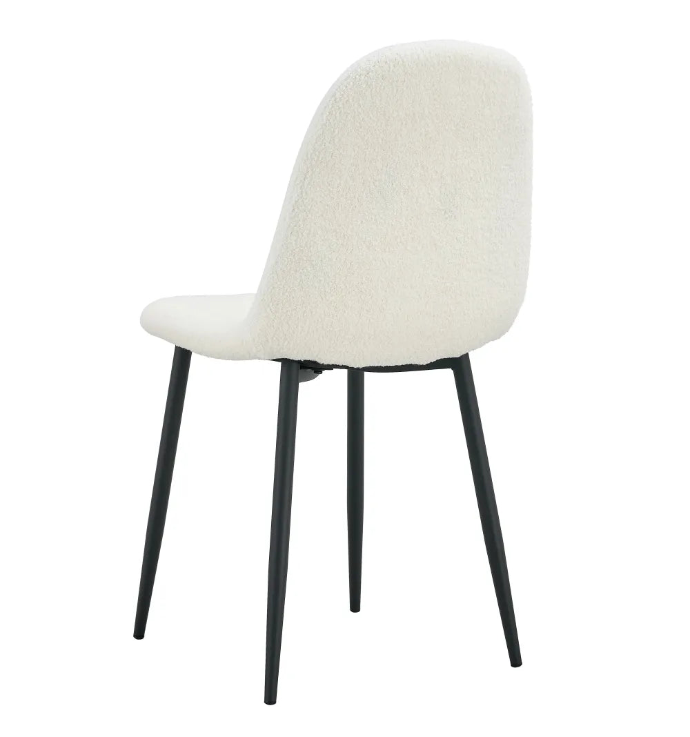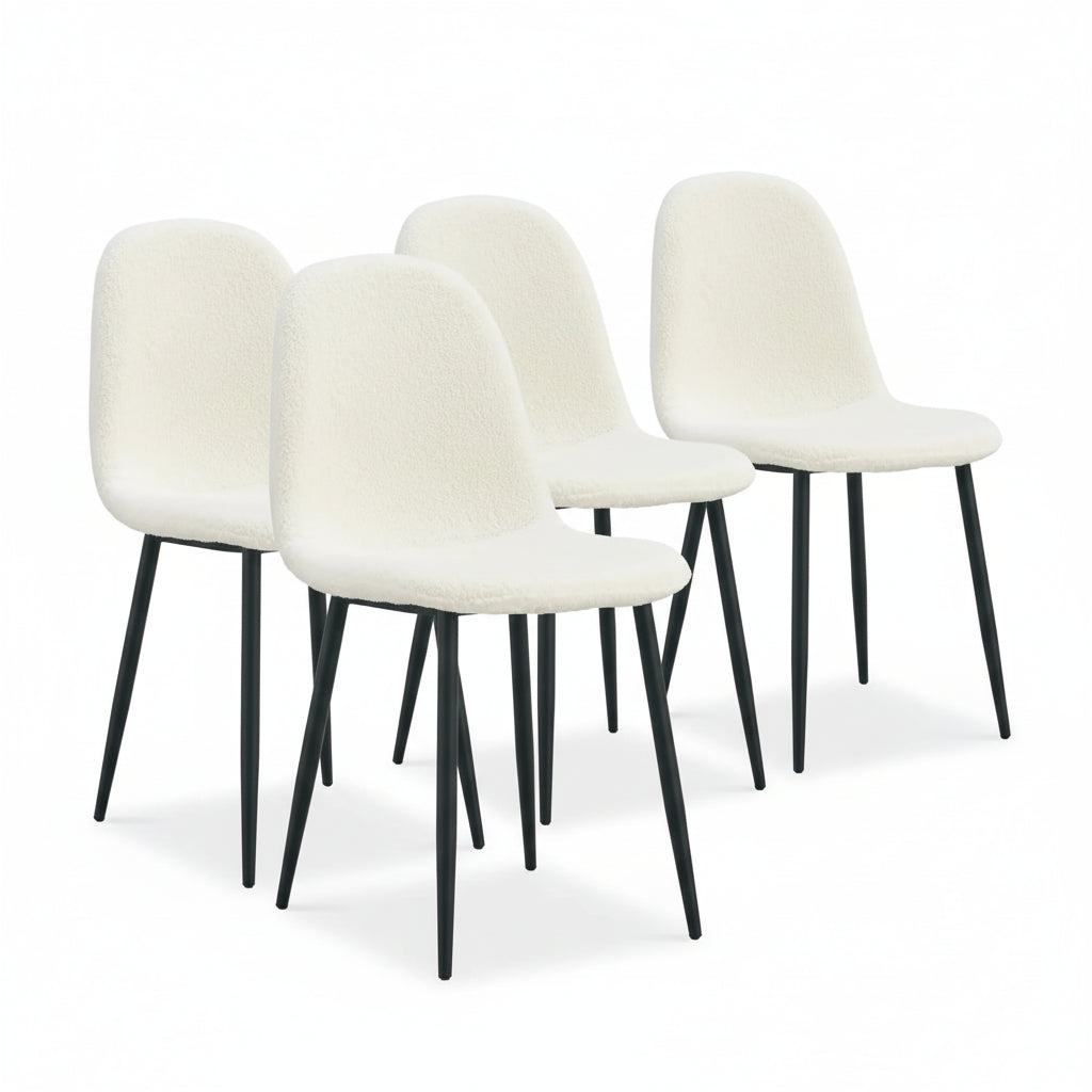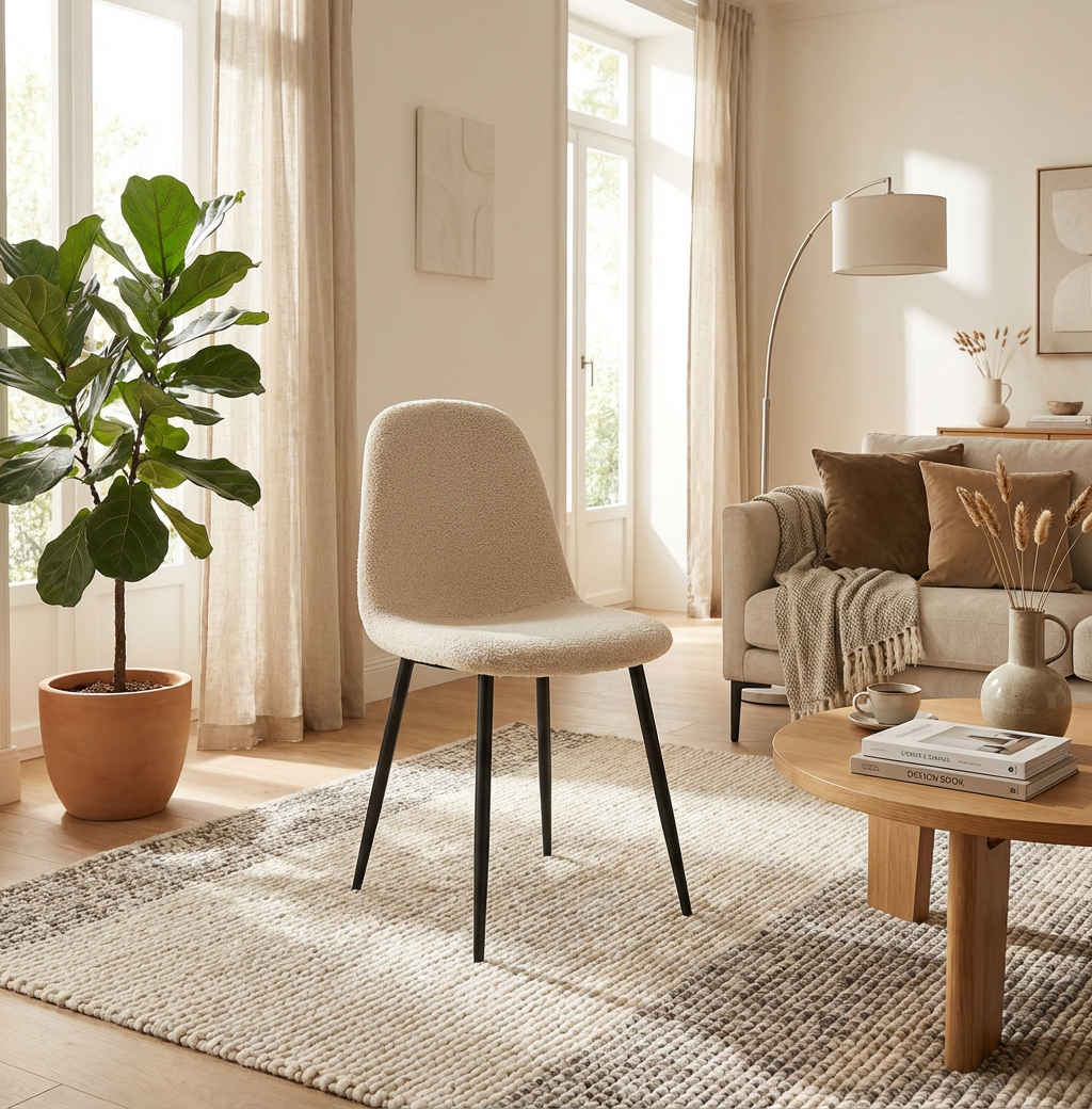 Ce lot de 4 chaises scandinaves s’intègre facilement dans une salle à manger, une cuisine ou un espace de travail. Leur revêtement effet doudou associé à une assise en mousse polyester molletonnée offre un accueil confortable au quotidien. Le dossier fixe permet un bon maintien lors des repas ou des moments prolongés assis. Le piétement en métal noir assure stabilité et résistance pour un usage régulier. Grâce à leur format compact, elles se placent aisément autour d’une table tout en conservant une circulation fluide dans la pièce.