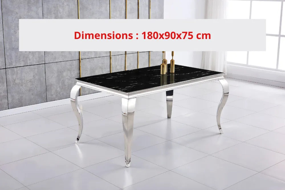 Découvrez la table à manger Baroque en verre effet marbré noir, pieds chrome 180×90 cm. Pour 6 à 8 couverts. Livraison rapide.