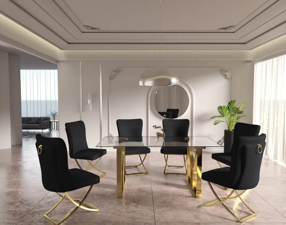 Adoptez la table à manger Igrec en verre transparent avec des pieds dorés. Design luxueux et moderne. Livraison rapide.