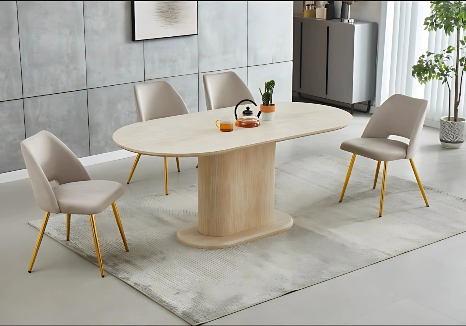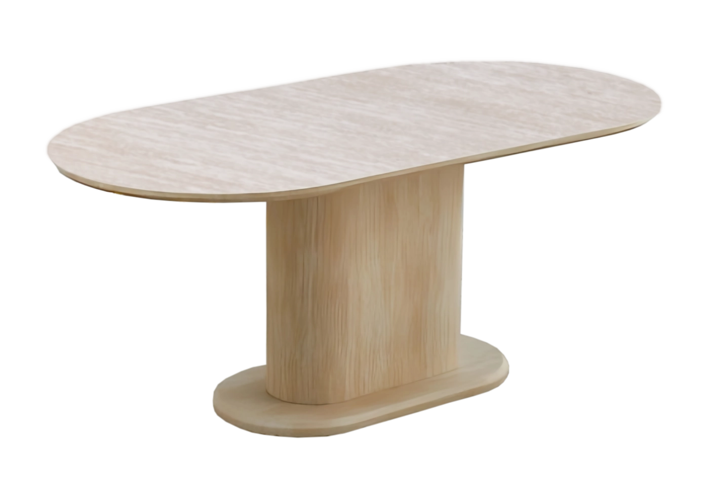 Avec son plateau effet travertin aux angles adoucis et son pied central cannelé, cette table ovale devient un vrai centre de gravité déco. Elle attire l’œil tout en laissant circuler la lumière et la convivialité.