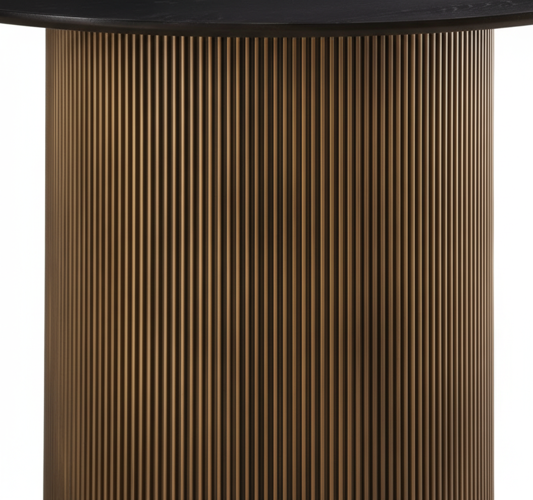 Sa base cylindrique texturée, ornée de rainures verticales finition gold, attire immédiatement le regard et confère à la table une allure architecturale unique. Ce contraste subtil entre le noir profond du plateau et les accents dorés de la base crée un équilibre parfait entre sophistication et design contemporain.