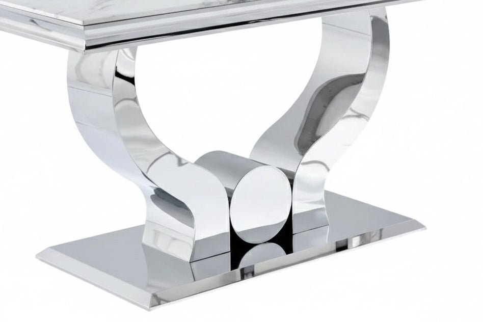 Sa silhouette élégante est soutenue par un pied central en acier inoxydable chrome, promettant robustesse et style. Le plateau en verre trempé, disponible en Marbré Blanc, Marbré Noir, et Noir, ajoute une touche de luxe sans compromettre la durabilité.