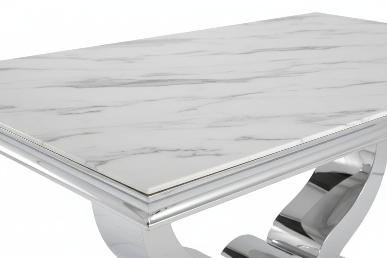 Table à Manger Trofy Verre Marbré Blanc Pieds Métal Chrome 150×90 cm