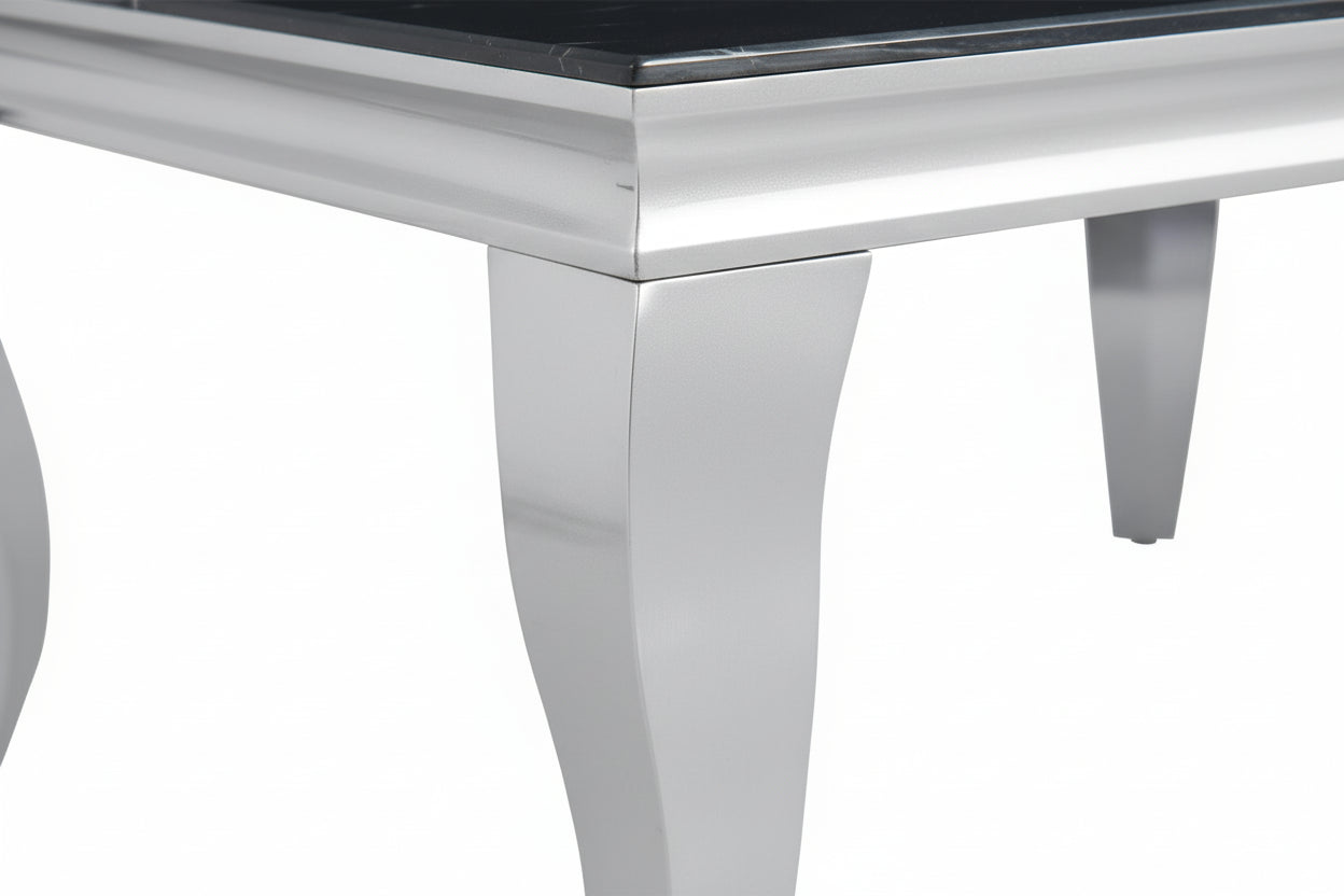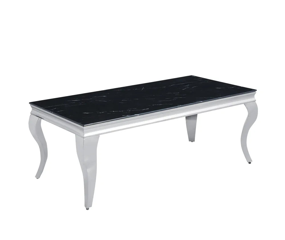 Table Basse Baroque Rectangle Verre Trempé Marbré Noir Pieds Chrome 120x60x45 cm