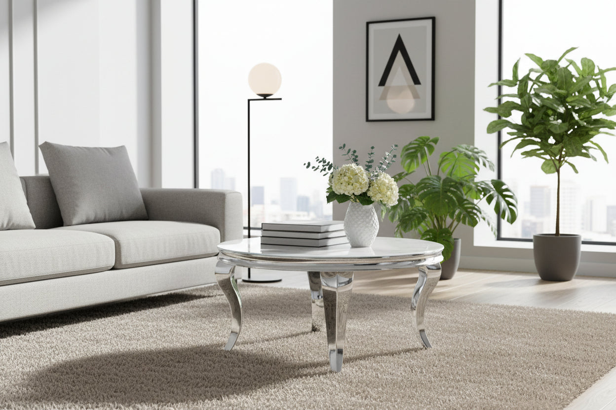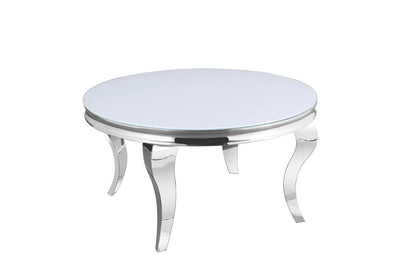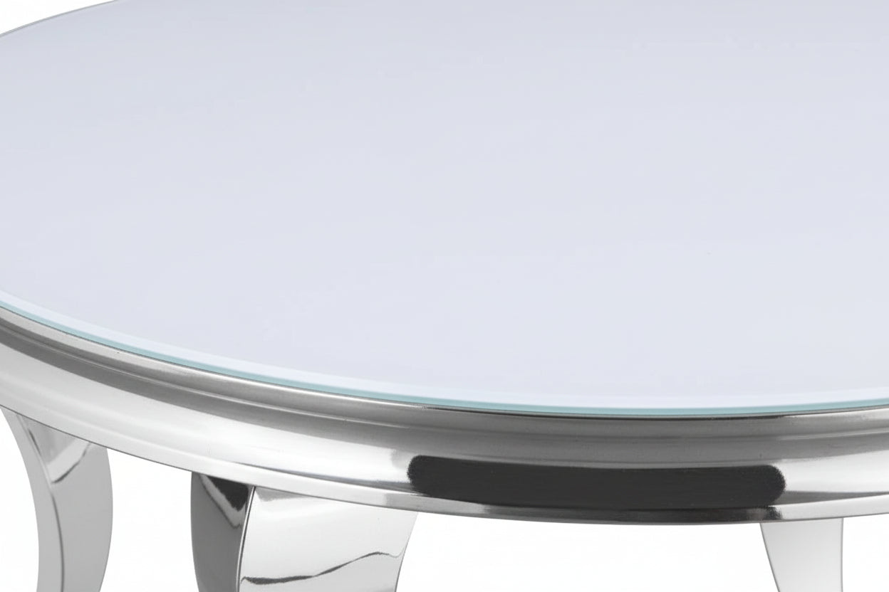 Table Basse Baroque Ronde Verre Trempé Blanc Structure Chrome D80x45 cm