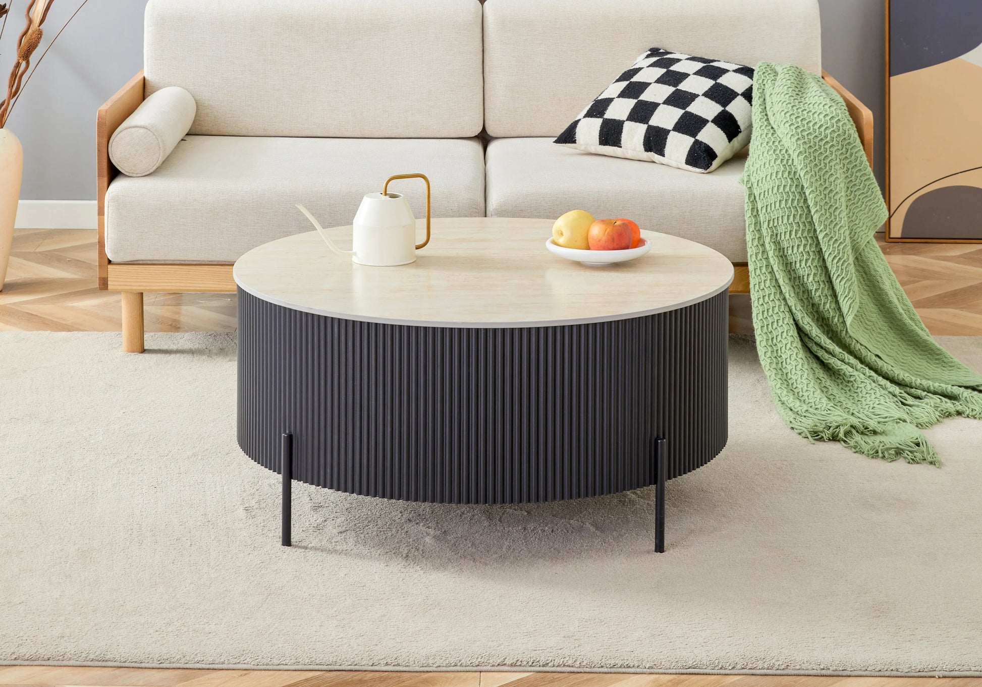 Table Basse Lira Ronde Travertin Pied Cannelé Noir
