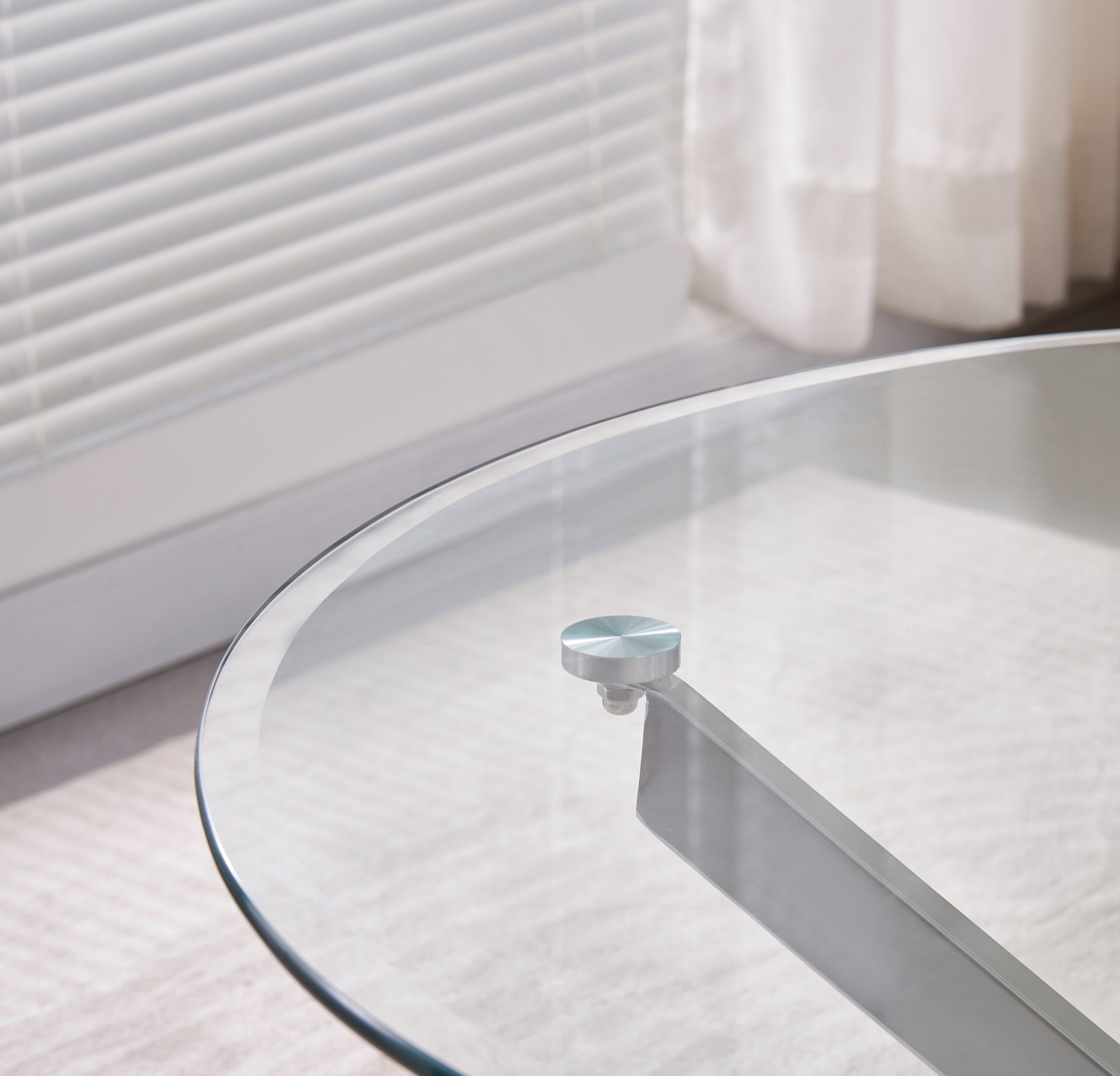Le plateau en verre transparent permet de laisser passer la lumière, donnant une impression d’espace et de fluidité dans la pièce. Il offre également une surface lisse, facile à entretenir, tout en mettant en valeur la structure argentée raffinée.