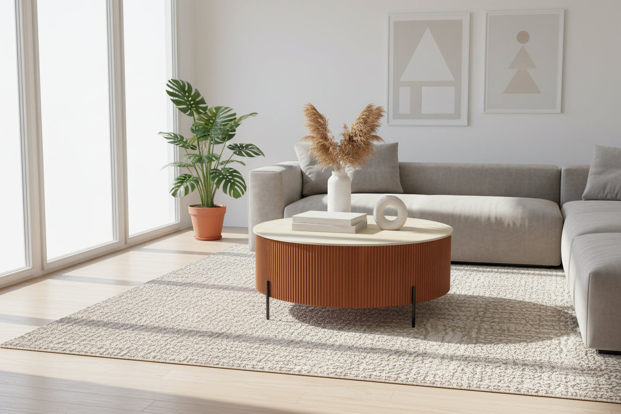 Grâce à son diamètre généreux, RUBY devient une vraie pièce centrale : idéale pour accompagner un grand canapé, recevoir vos invités, poser vos objets déco, livres et plateaux apéritifs. La céramique est pensée pour la vie quotidienne : facile à nettoyer au chiffon doux, elle conserve son rendu haut de gamme dans le temps. Si vous recherchez une table basse ronde Ø90 effet travertin dans une teinte noisette chaleureuse, la RUBY combine élégance, praticité et présence.