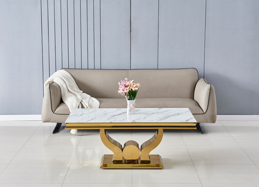 Découvrez la table basse TROFY, une pièce de caractère qui associe design moderne et finitions haut de gamme. Son pied central en métal Gold donne un éclat raffiné et une allure luxueuse, tandis que son plateau en verre trempé effet marbré blanc illumine votre intérieur avec une touche chic et contemporaine.