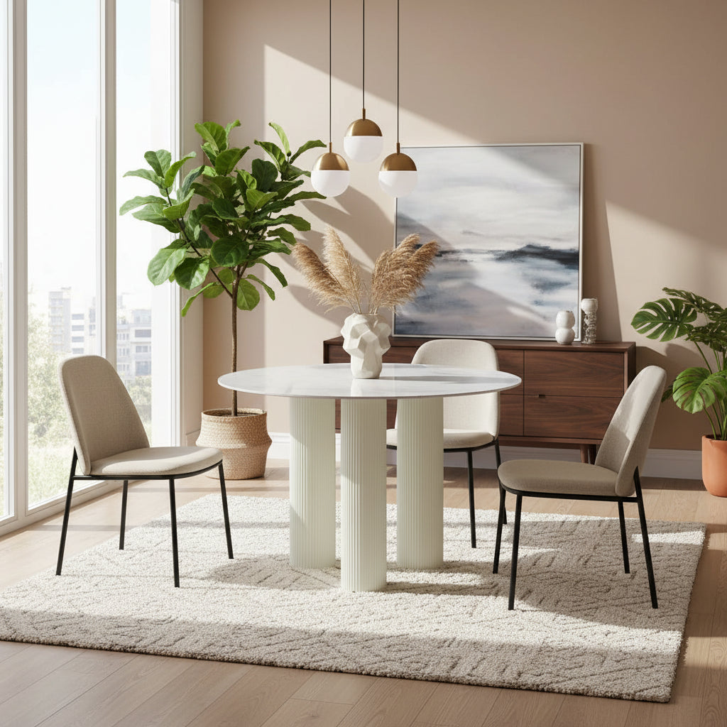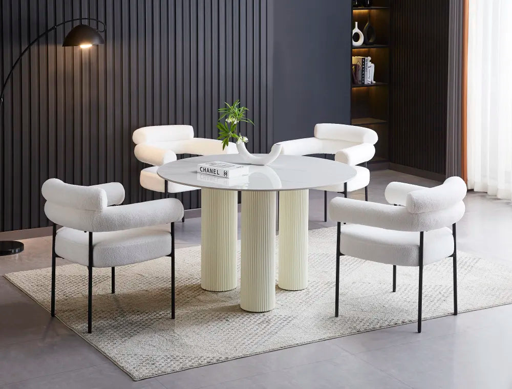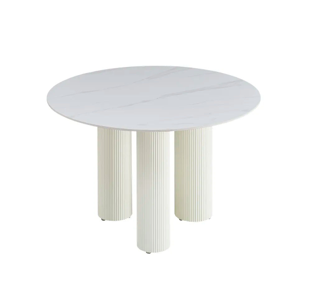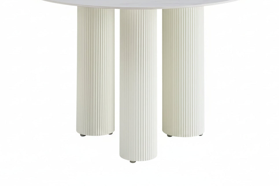 Table repas ronde au design contemporain et élégant, équipée d’un plateau en céramique marbré blanc de haute qualité et de pieds cylindriques beiges texturés. Son style épuré s’intègre facilement dans une salle à manger moderne ou classique. Résistante et fonctionnelle, elle offre une solution idéale pour un usage quotidien tout en apportant une touche lumineuse et raffinée à votre intérieur.